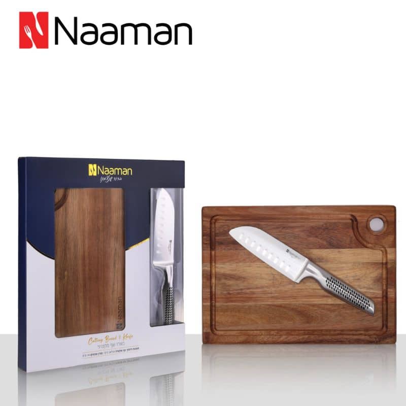 הרכב המארז: סכין סנטוקו 14 ס"מ נירוסטה + קרש חיתוך אקשייה