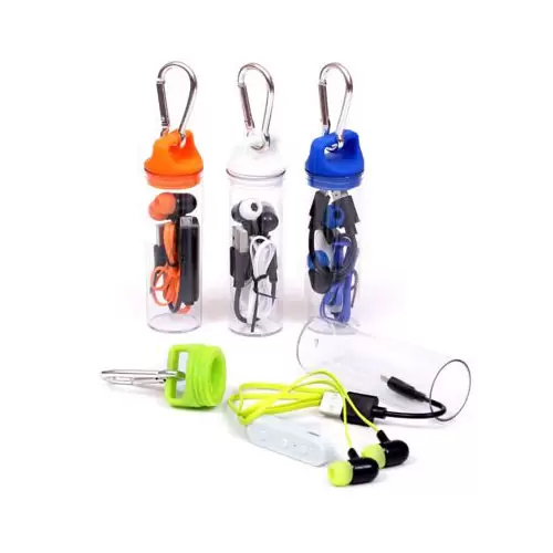 אוזניות כבל עם כפתורי סיליקון המגיעות בתוך קופסא עגולה ומקל מגע לניידים