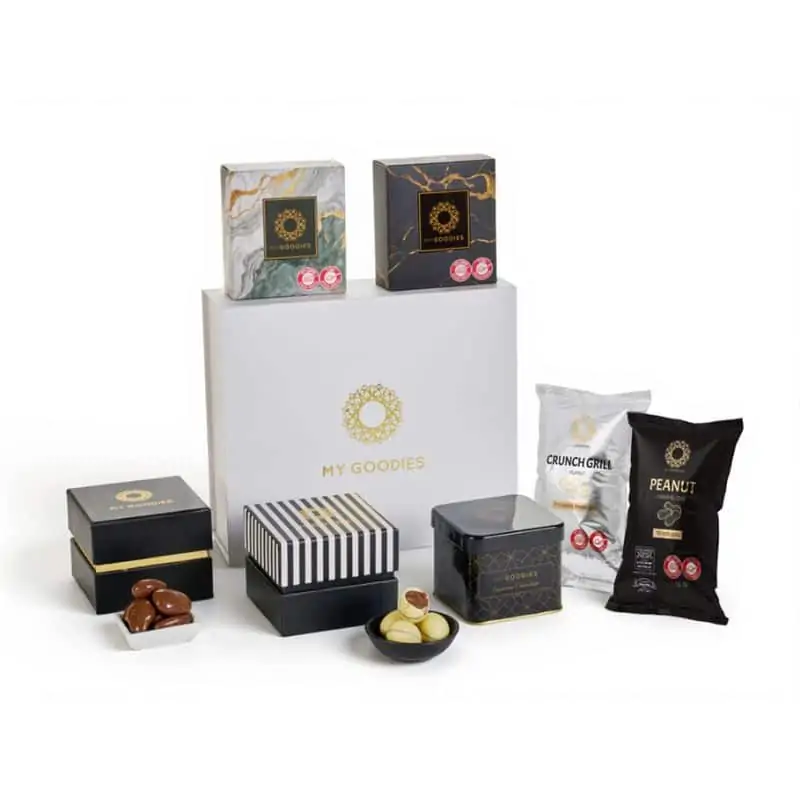 ארגמן – קופסת פח המכילה אגוזי פקאן מקורמלים בעיטוף שוקולד חלב