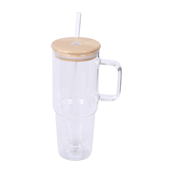 כוס זכוכית 650 מ"ל עם ידית, מכסה במבוק וקש