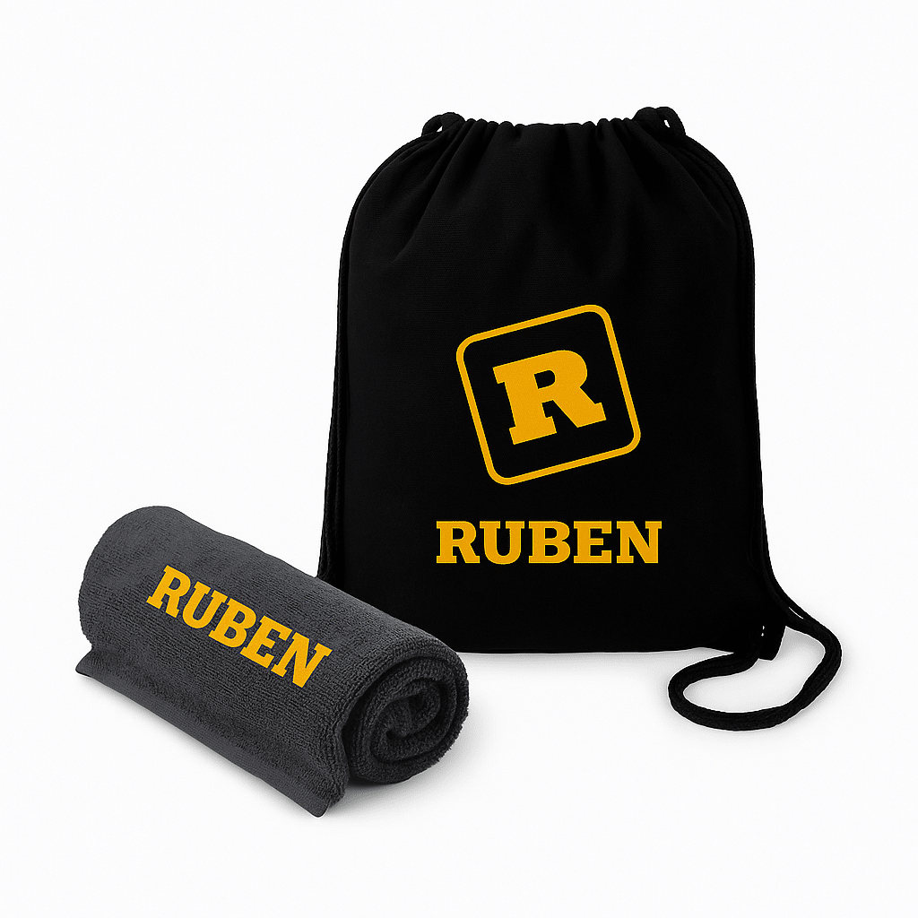 סט של מגבת מיקרופייבר ממותגת בתוך תיק שרוכים עשוי כותנה איכותי במיוחד